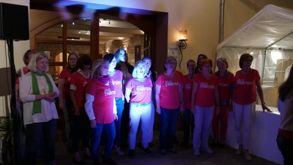 Es ist immer wieder erstaunlich festzustellen, welche Fähigkeiten unsere Chormitglieder haben. Im September haben unsere Mitsängerinnen Helgard und Blanca uns überrascht. Die beiden haben wir mit der Organisation unseres jährlichen Probenwochenendes beauftragt. Wir waren auf arbeitsame und karge Tage im gewohnten Jugendherbergsambiente eingestellt. Statt dessen haben die beiden uns ein echtes Event-Wochenende geplant. Übernachten im Weingut, proben im Kulturgut , in den Singpausen und abends Weinprobe, inkl. Konzert und MissHarmony Kurzauftritt. Das Ganze im Ambiente eines idyllischen rheinhessischen Weindorfs. Und was wir alles gelernt haben. Wir können jetzt nicht nur alle Barbershop-Stücke perfekt, sondern auch 10 verschiedene deutsche Weine am Geschmack erkennen. Die Latte liegt jetzt hoch und die beiden haben den Job jetzt. Wo fahren wir im nächsten Jahr hin?