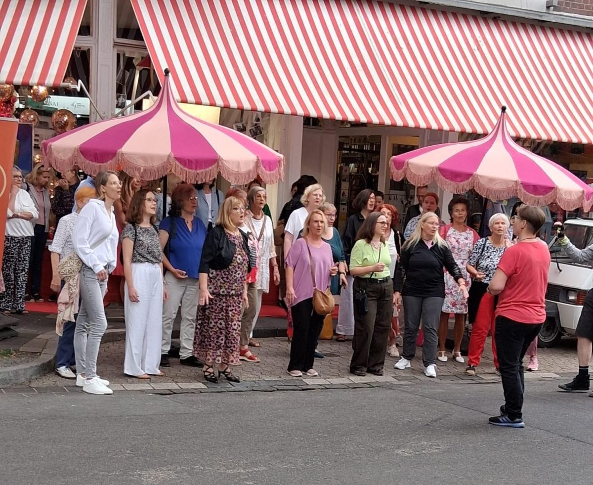 Pst! Geheim. Wir haben ihn nicht verraten, unseren ersten Flashmob-Auftritt. Die Gesichter der Passanten: unbezahlbar. Der Spassfaktor für unsere Sängerinnen: riesig. Wir danken der Parfümerie Nagelschmitz in Oberkassel für die Einladung, das 50jährige Fimenjubiläum mit einem Flashmob mitzugestalten.