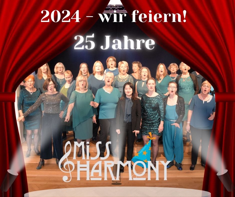 Wir feiern in diesem Jahr 25 Jahre Barbershop-Chor MissHarmony und feiern mit einem großen Jubiläumskonzert am Samstag, 21. September 2024 um 19 Uhr 30 (Einlass ab 19 Uhr) im Palais -Wittgenstein, Bilker Str. 7-9, Düsseldorf. Der Eintritt ist frei. Es sind nur noch wenige Restkarten vorhanden. Bei Interesse nehmt bitte Kontakt mit uns auf. Keine Abendkasse!