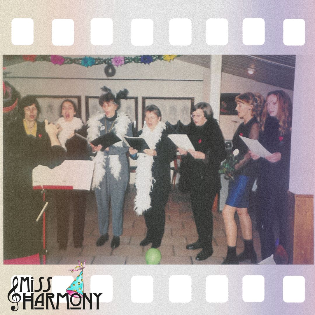 Da braucht man keinen Filter, das sieht auch ganz ohne Bearbeitung retro aus. Voilà, das erste überlieferte Foto von MissHarmony, geschossen ein Jahr nach der Gründung, im Jahr 2000. Zum ersten Repertoire gehörten hauptsächlich Barbershop-Klassiker, z.B. Heart of my heart und Sentimental journeyMit Barbershop waren wir in Deutschland ganz vorne damals, es gab nur ganz wenige Ensembles.