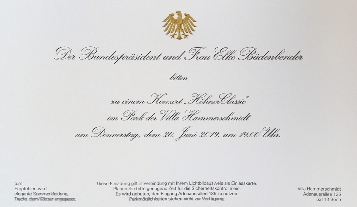 Miss Harmony war auf Einladung des Bundespräsidenten und seiner Frau im Garten der Villa Hammerschmidt zu Gast. Wir ehrenamtlich engagierte Sängerinnen wurden von höchster Stelle mit einem Konzert „Höhner Classic“ belohnt. Es war festlich, fröhlich und sehr entspannt. Wir sind stolz, dass wir unter den 750 geladenen Gästen sein durften, zusammen mit weiteren ausgewählten Chören aus NRW.