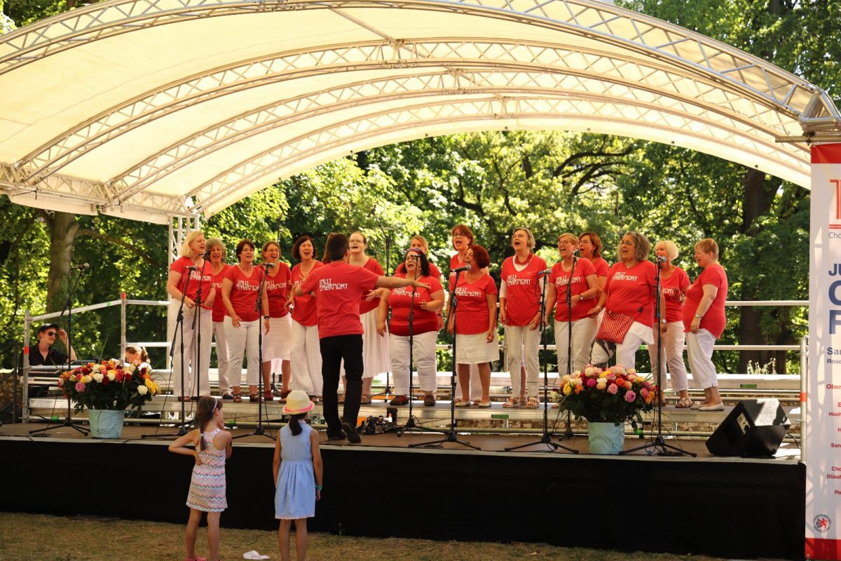 Vor der denkbar schönsten Kulisse in Düsseldorf, dem Rosengarten hinter dem Stadtmuseum, hatte der Chorverband seine Jubelbühne errichtet. Und als ein Mitgliedschor, der selbst in diesem Jahr Jubiläum feiert, durfte MissHarmony das Programm mitgestalten. Eine schicke Urkunde gab es auch, und eine schöne Gelegenheit mal wiederzusammen mit Düssharmonie 8stimmig zu singen.